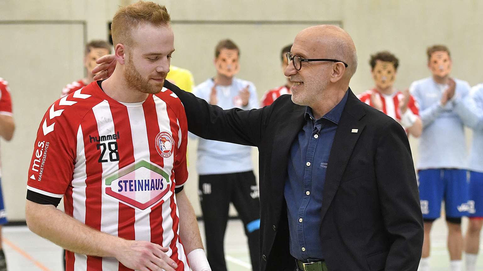 Man mag sich gar nicht vorstellen, wohin der Karriereweg des Rückraumspielers hätte führen können, wenn er nicht viel zu oft mit Verletzungen zu tun gehabt hätte. Jetzt sind es allerdings berufliche Gründe, die ihn dazu bewogen haben, einen Schlussstrich zu ziehen. „Aber der Spielerpass bleibt bei der HGR“, sagte der gerührte Saalmann, ehe er von jedem einzelnen Mitspieler noch einmal geherzt wurde. „Einen schöneren Abschluss hätte ich mir nicht wünschen können.“ Am Ende der temperamentvollen Partie gab es auf den Rängen stehende Ovationen für den „Tiger“, wie er im Mannschaftskreis genannt wird. Weshalb seine Teamkollegen sich zur besonderen Huldigung auch Pappmasken im Tigerdesign über die Gesichter gezogen hatten. Dies allerdings nur vor der Begegnung.